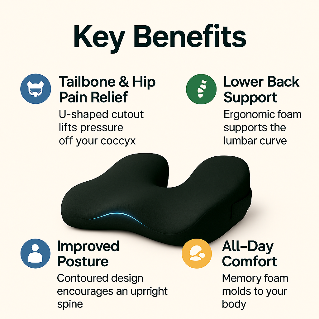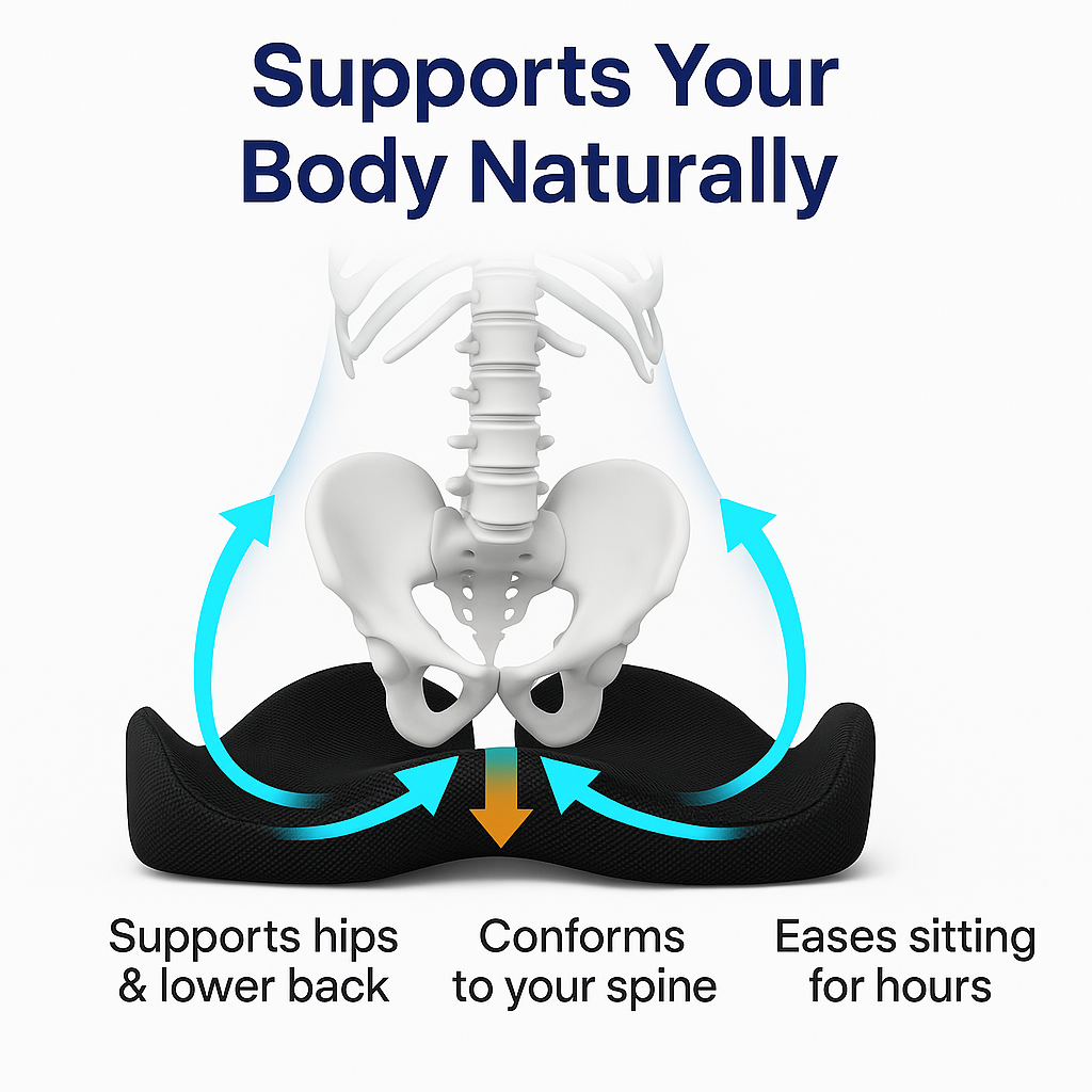 Promotes proper spine alignment and reduces pressure on the tailbone (coccyx)—ideal for sciatica, herniated discs, or general lower back pain.