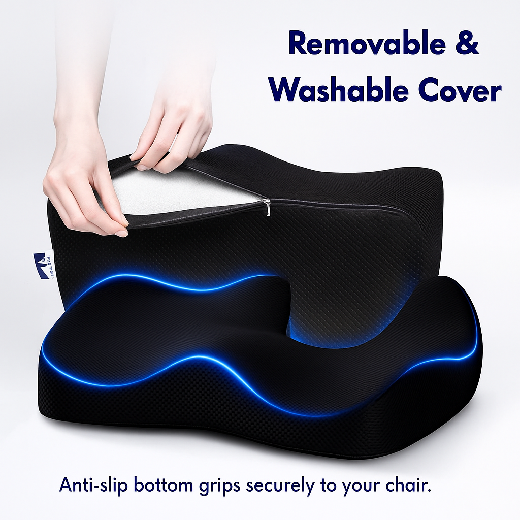 Most cushions fail because they’re just flat foam with no ergonomic design. This cushion has a U-shaped cutout to reduce coccyx pressure, contoured memory foam to align your spine, and a non-slip base to keep it in place. It’s not just a cushion — it’s a solution.
