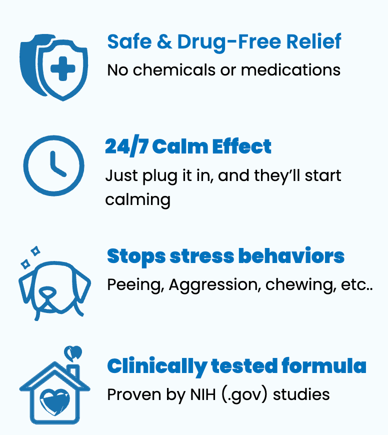 The PetMD Pheromone Plugin releases synthetic calming pheromones 24/7 - the SAME pheromones mother dogs naturally produce to comfort their puppies.
