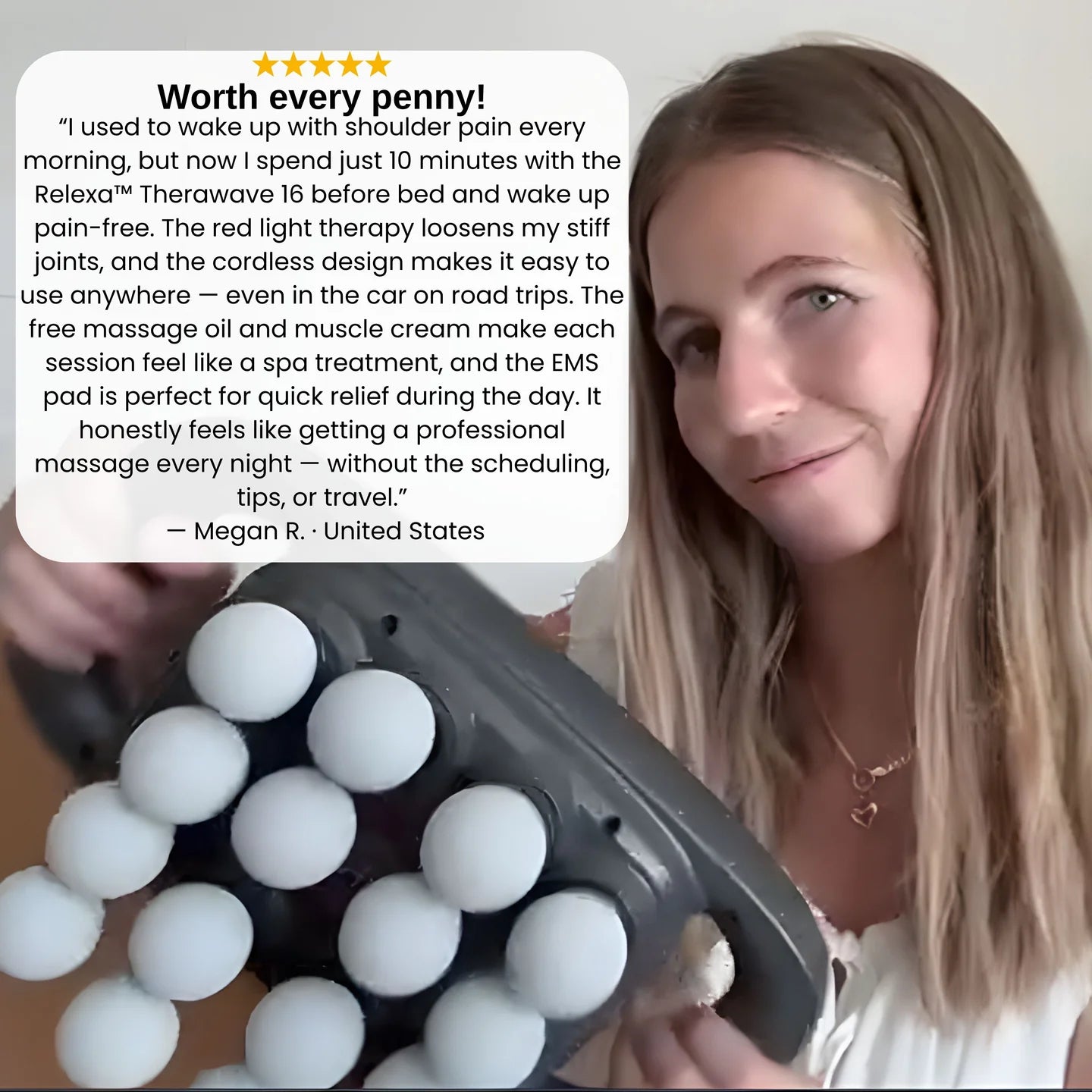 "This massager completely changed my recovery routine. I use it every evening, and my muscles feel lighter, more relaxed, and ready for the next day."